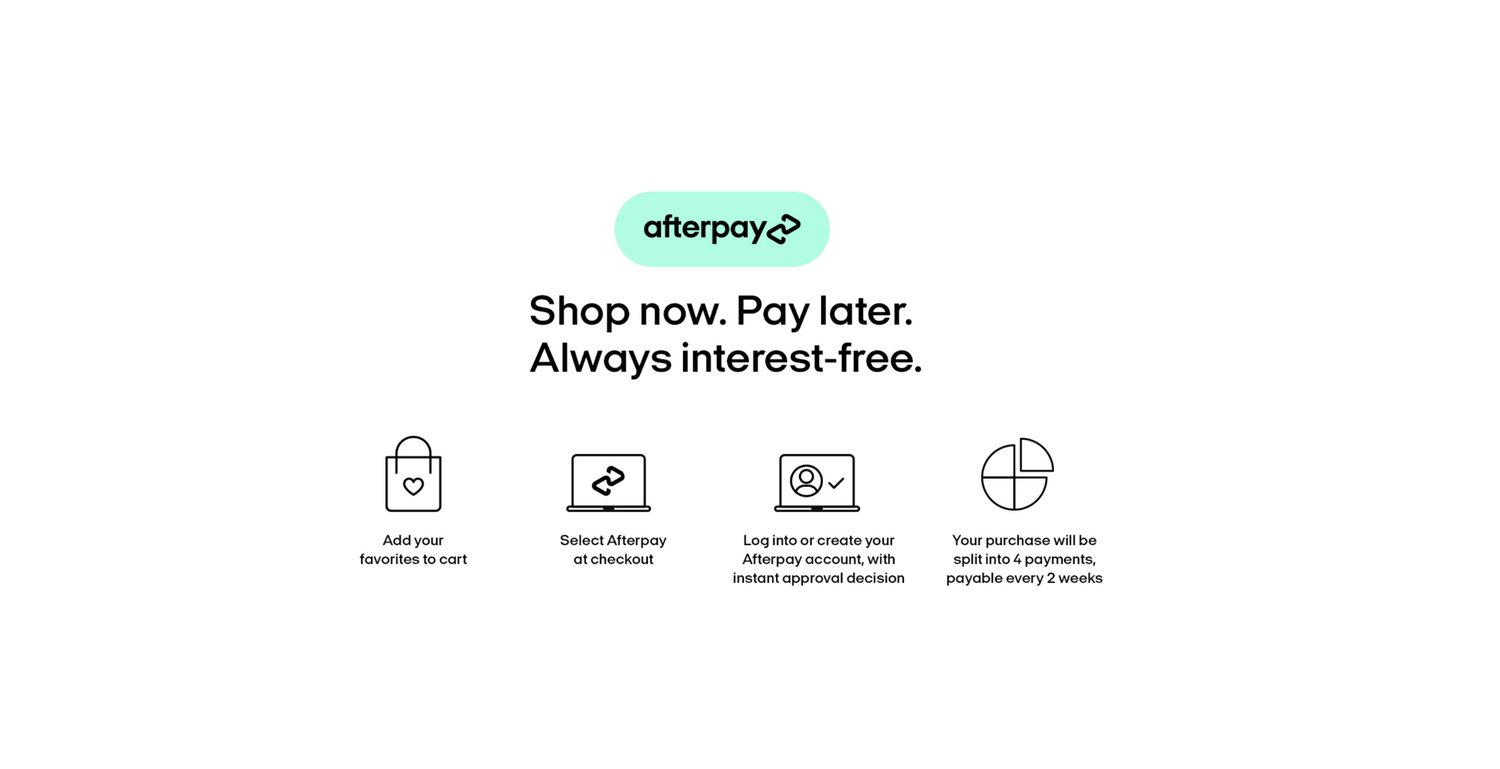 Simply shop online and add items to your shopping bag and checkout as normal. At the checkout choose Installments by Afterpay as your payment method. First-time customers will need to register with Afterpay and provide payment details, as usual, returning customers simply log in to make their purchase. It’s that easy!